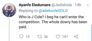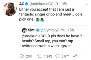 Adekunle Gold replied her as thus: “Either you accept that I am just a fantastic singer or go and meet J cole. pick one.??”