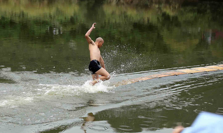 The challenging kung fu stunt is performed by dashing across thin plywood planks laid on the surface of the water.