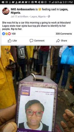 A Facebook user who goes by the name ‘Ejeh Innocent’ just shared a post about a woman who was hit by a car, the woman happens to be an FCMB Staff according to the ID Found in her bag and she goes by the Name ‘Ogochukwu Muoneke” and her Staff ID Number is 12713.