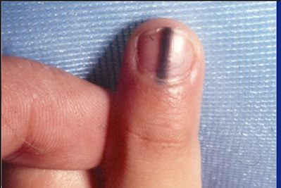 Melanoma is a type of skin cancer that most commonly results from high exposure to UV light. In a patient who suffers from melanoma, the cells that produce melanin divide uncontrollably. Symptoms of melanoma include discolorations of various parts of the body, including the nails. These spots of discoloration can change shapes or colors, or produce blood.