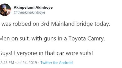 A Lagos based Nigerian Man just revealed how he was robbed by men wearing suits on Third Mainland Bridge. He…